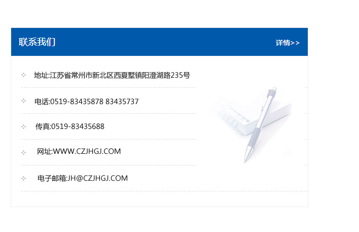 地址:常州市新北區友邦商務大廈1幢16、17層  電話:0519-85101652  傳真:0519-85112595  郵編:213022  網址:www.cz-jiayue_cn.taotaokj.com  郵箱:xiajifengaa@163.com